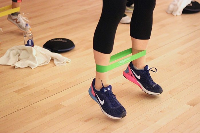 Our workout started with a warmup packed with props like sand bells, bands and a towel.